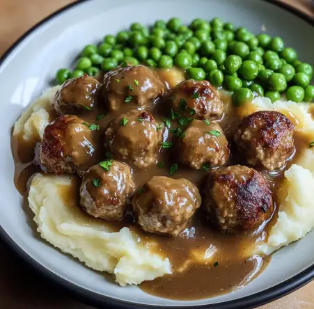 - Return meatballs to the gravy and heat through before serving with mashed potatoes, peas, and jam.