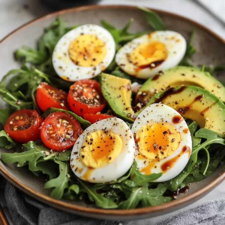 Avocado Arugula Salad with Jammy Eggs & Creamy Balsamic Drizzle