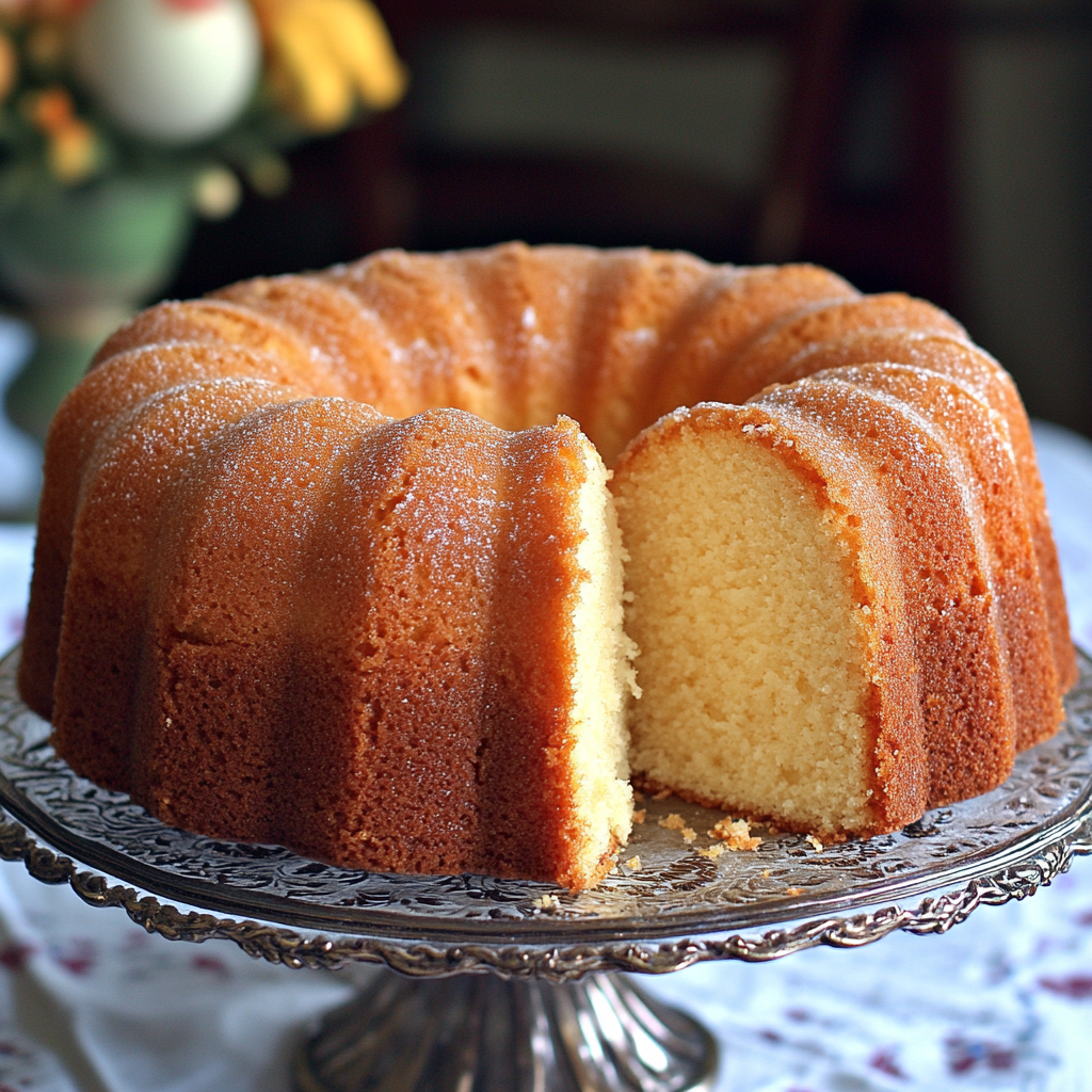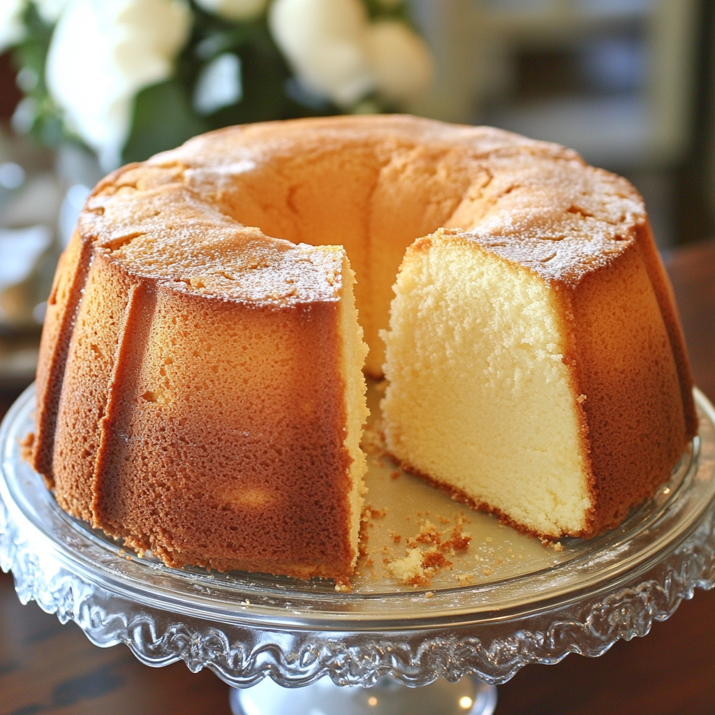 The balance of equal parts flour, sugar, butter, and eggs makes this recipe classic. It creates a rich and moist pound cake loved by many.