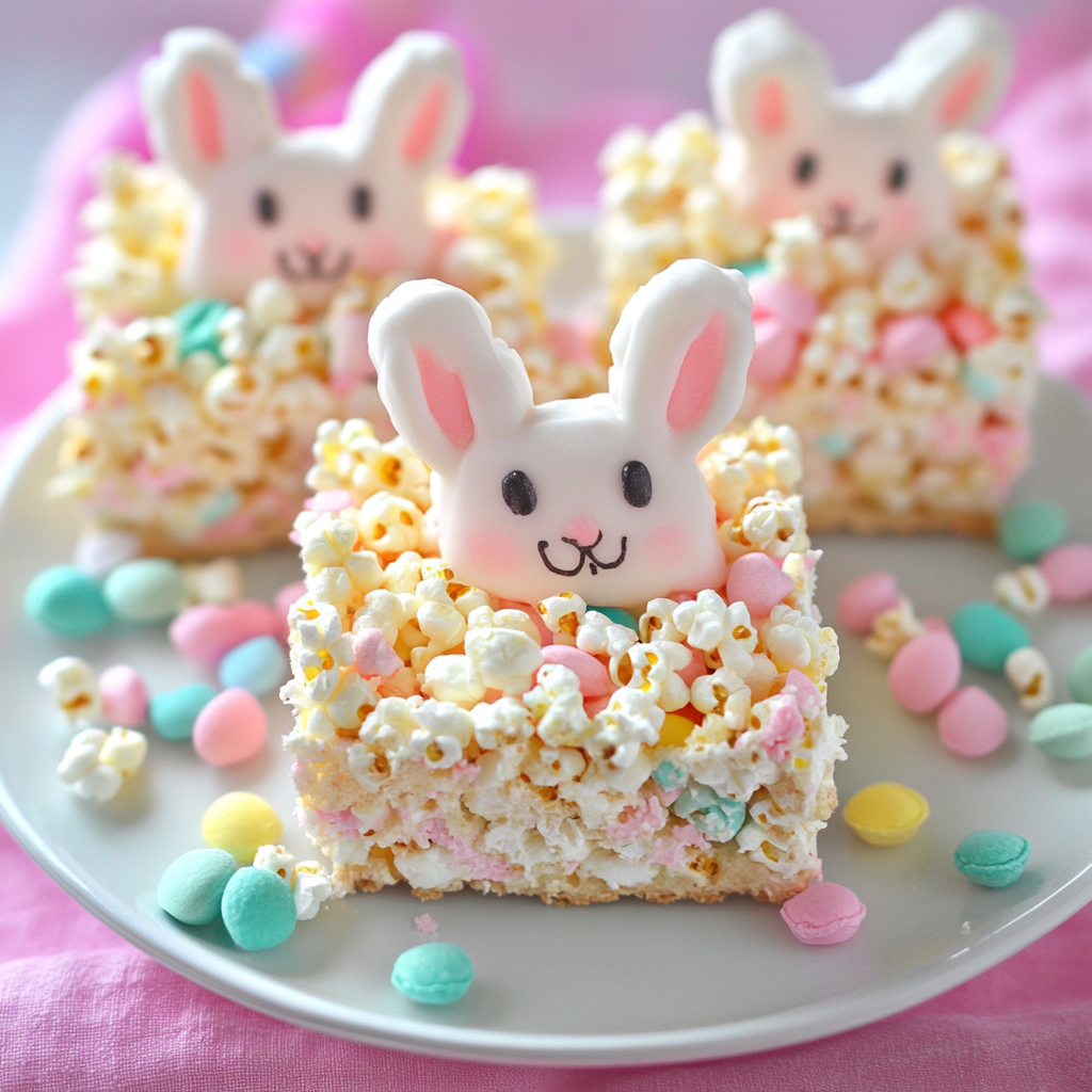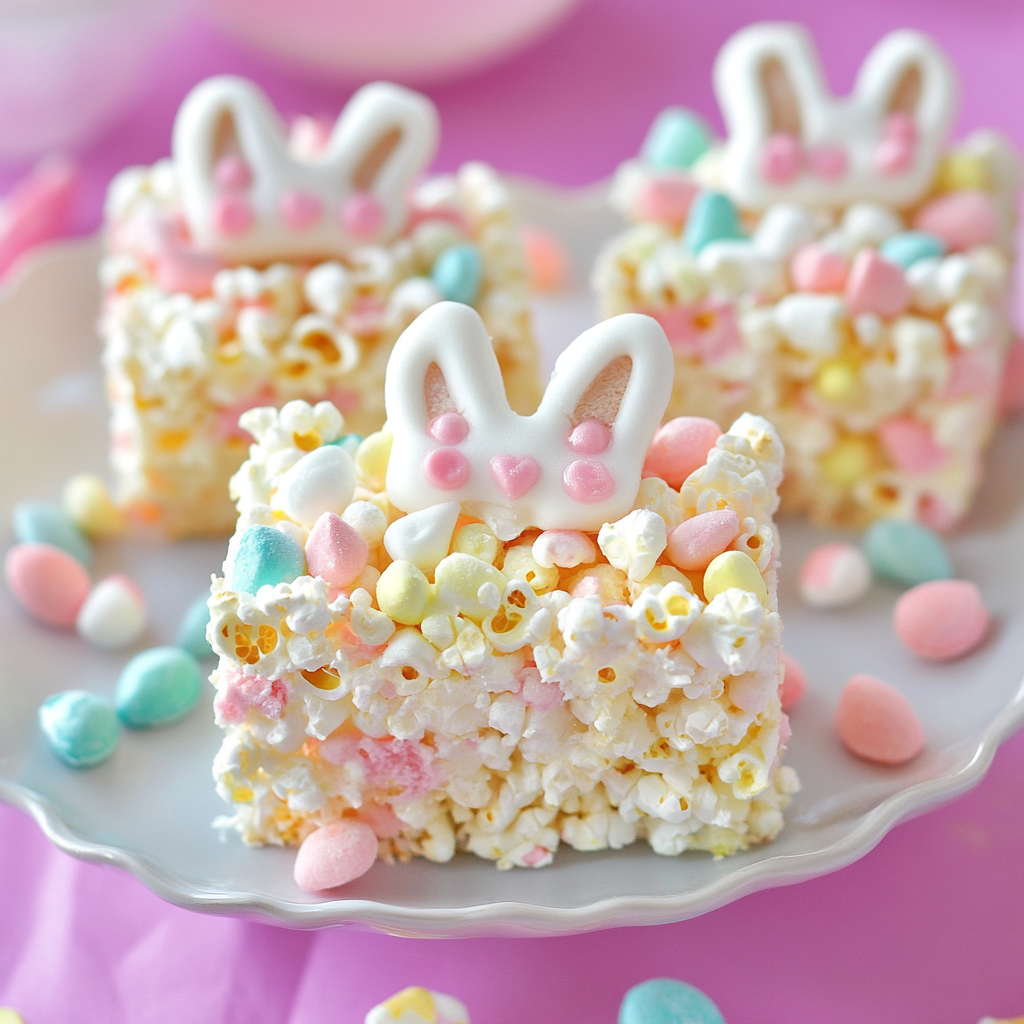 Enjoy these delightful Easter Bunny vegan marshmallows Popcorn Bars as a sweet treat that brings smiles all around!