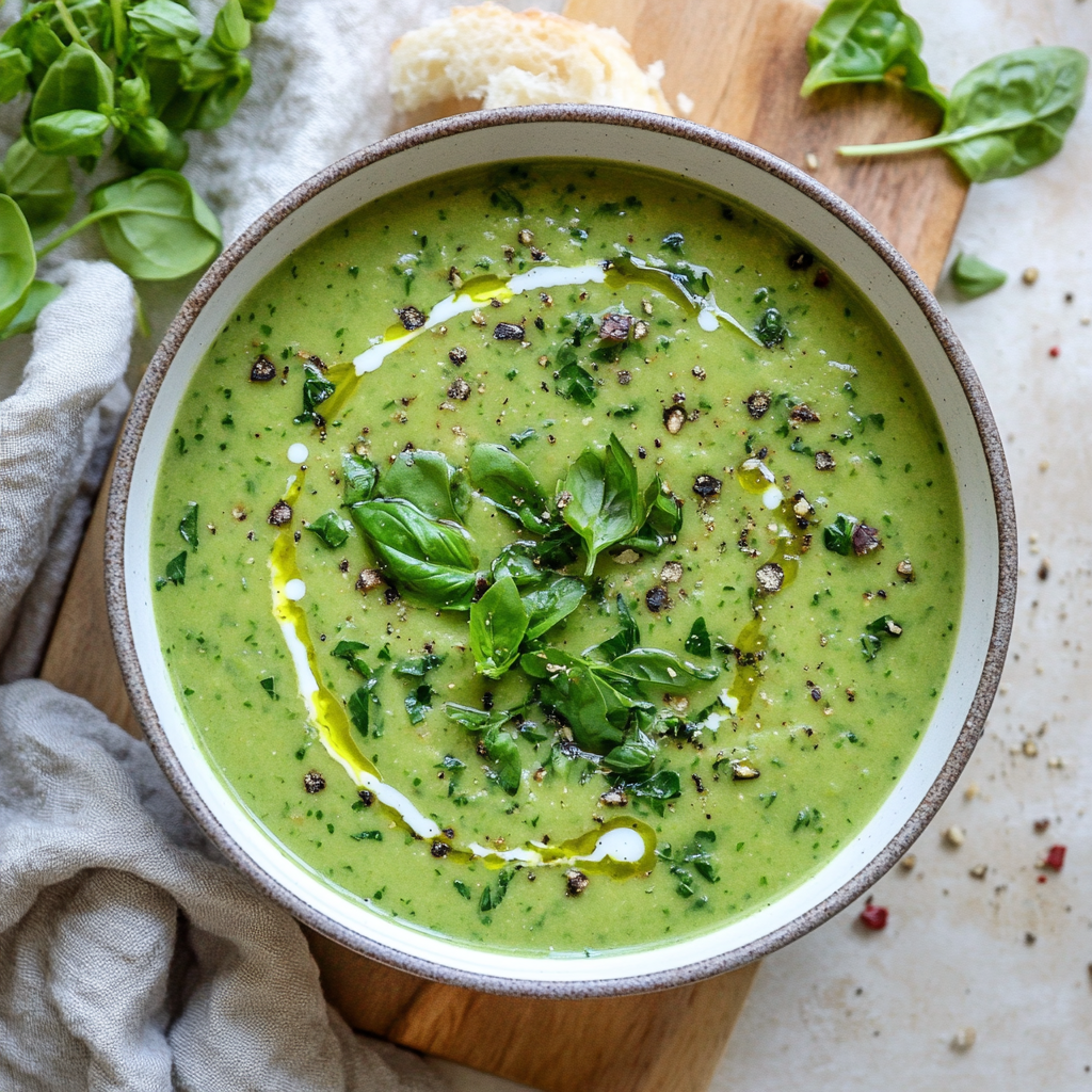 Green Goddess Herb Soup is a creamy, vibrant soup made with fresh herbs like basil and parsley, complemented by spinach and coconut milk.