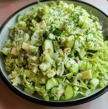 - In a large mixing bowl, combine finely chopped cabbage, diced cucumber, chopped chives, basil leaves, and fresh spinach.