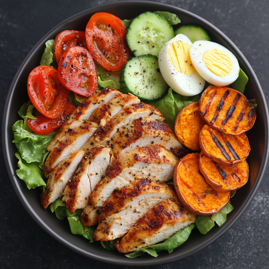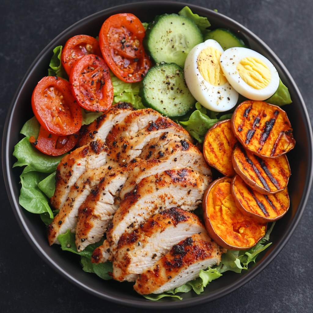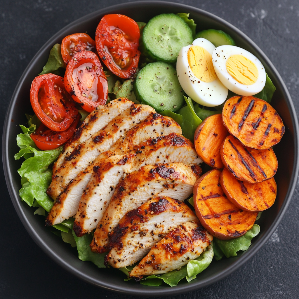 - Assemble by arranging the salad mixture on a plate with grilled chicken strips, roasted sweet potato rounds, and boiled egg halves.