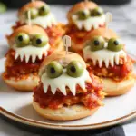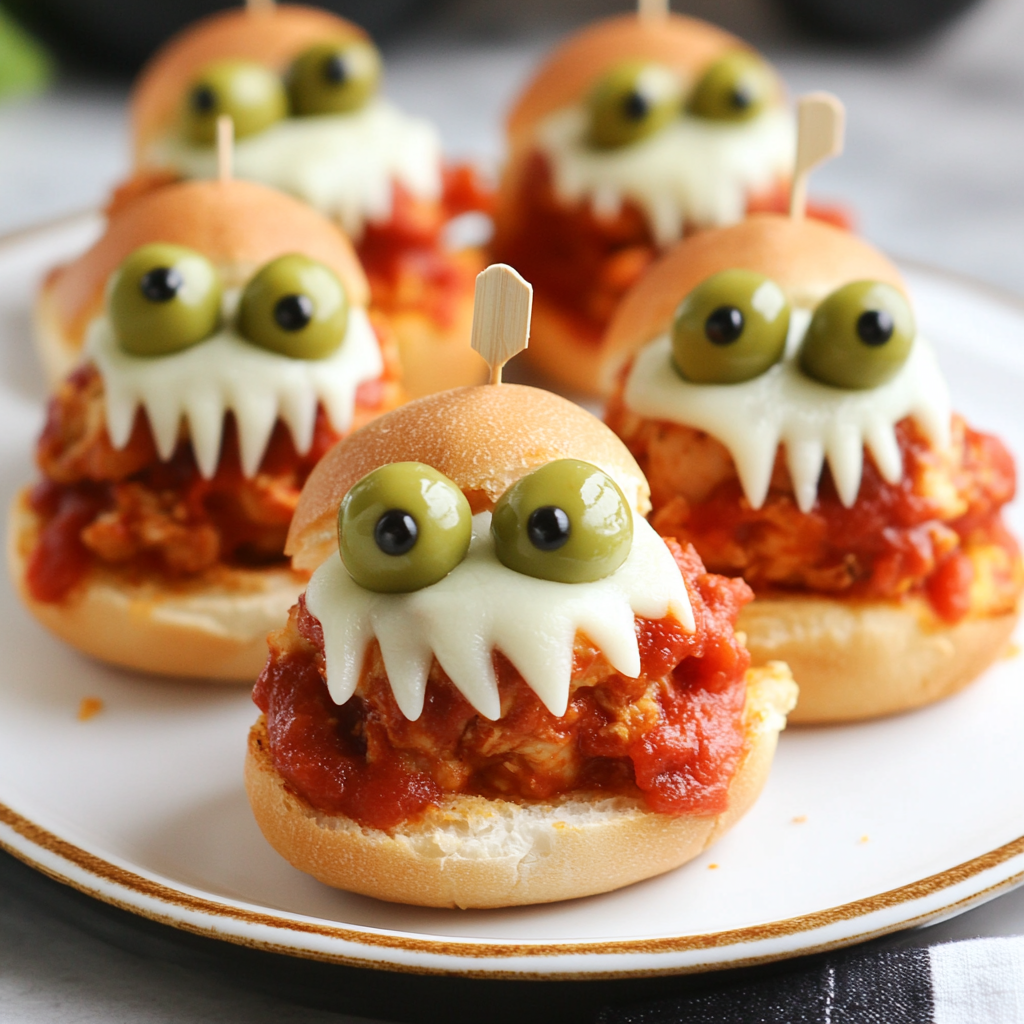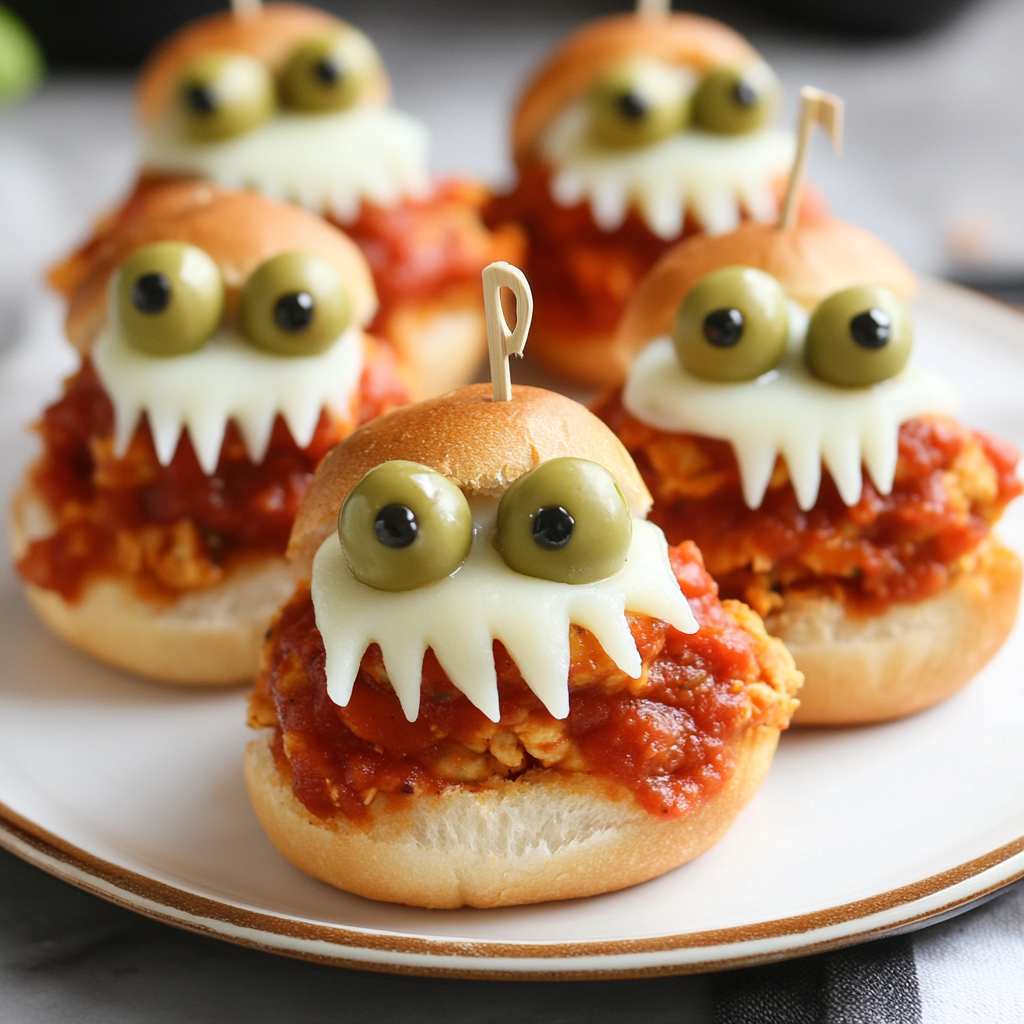 Halloween Chicken Parm Sliders are mini sandwiches made with chicken tenders, marinara sauce, and mozzarella cheese, decorated with olives to look like monster eyes—perfect for spooky celebrations!