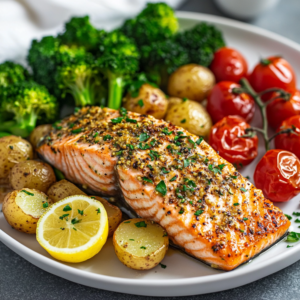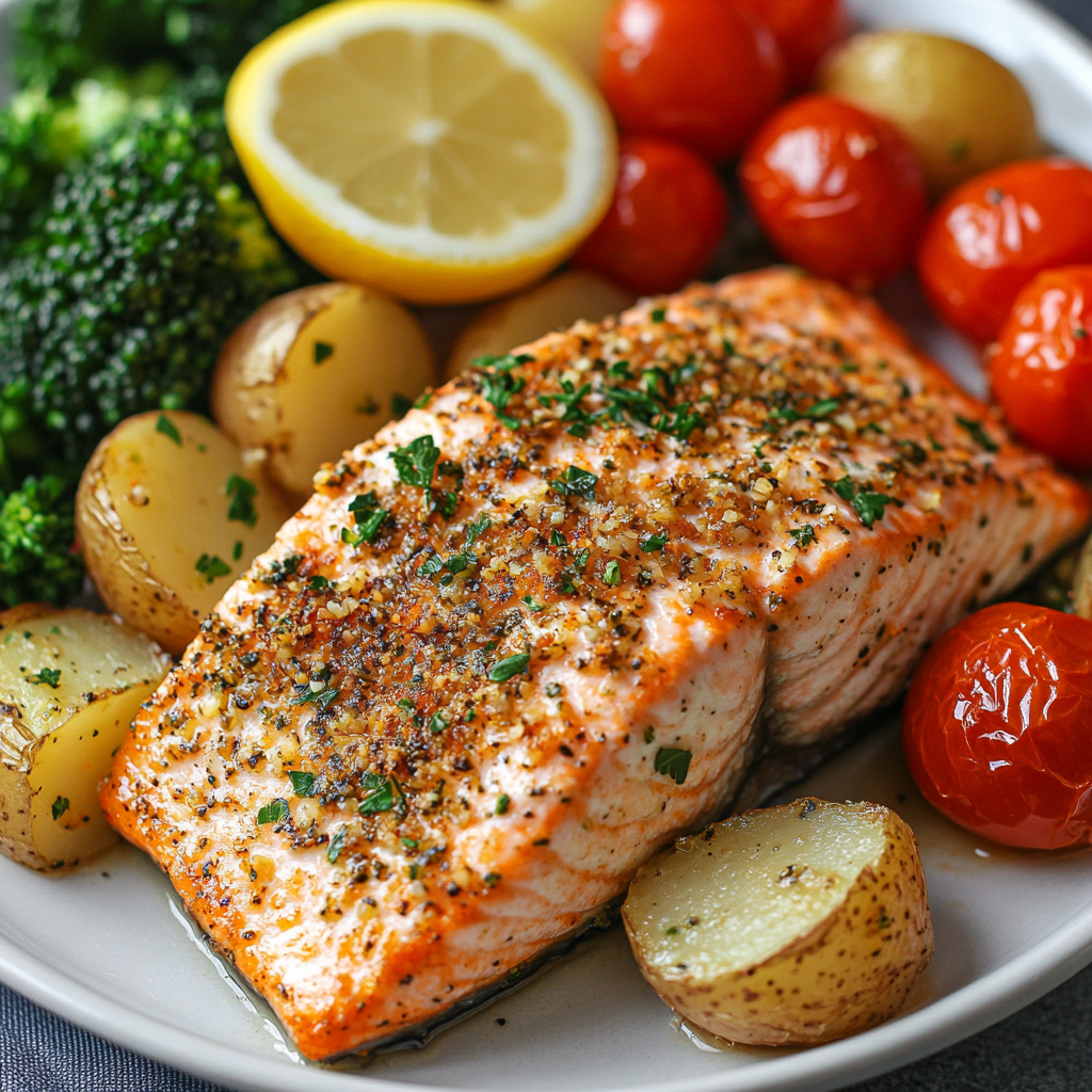 - Plate the salmon with roasted potatoes, tomatoes, and broccoli. Garnish with fresh parsley and serve with a lemon wedge.