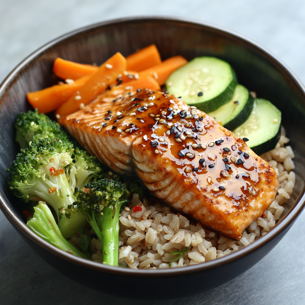 - Assemble the bowl by scooping warm brown rice into a serving dish, topping it with steamed veggies and glazed salmon.