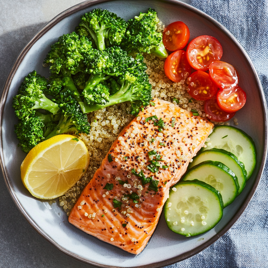 - Assemble by placing cooked quinoa on a plate alongside seared salmon, steamed broccoli, cucumber slices, and halved cherry tomatoes.