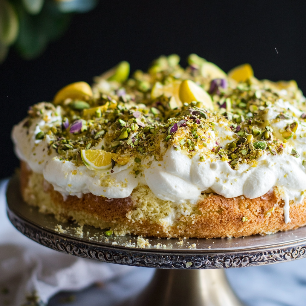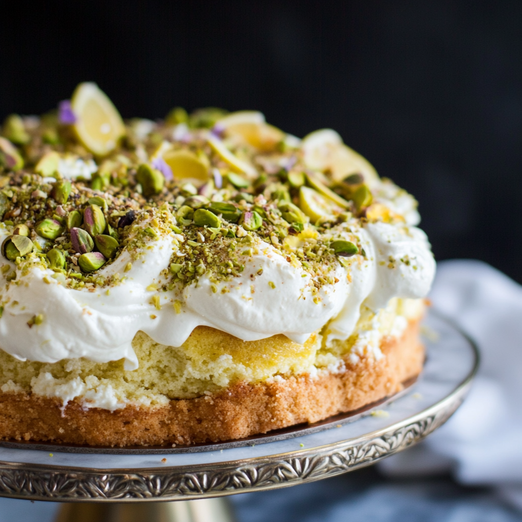 Indulge in the light and airy delight of Lemon Pistachio Ricotta Cloud Cake, a stunning dessert that combines the zesty brightness of fresh lemons with the nutty crunch of pistachios. This exquisite treat is ideal for any occasion—be it a cozy brunch, an elegant tea party, or a sweet afternoon snack. With its fluffy texture achieved through creamy ricotta cheese, every bite is a melt-in-your-mouth experience that leaves you wanting more. Easy to prepare and visually appealing, this cake is sure to impress your guests and elevate your dessert game. Serve it dusted with powdered sugar and garnished with extra pistachios for a delightful presentation.