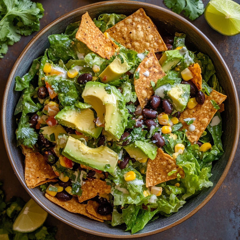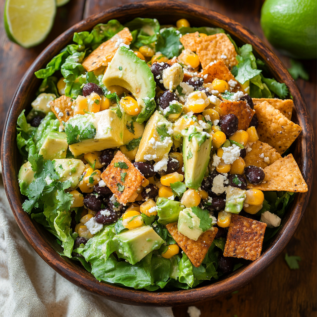 - In a large serving bowl, combine the chopped romaine lettuce, cooked corn, black beans, avocado, tortilla strips, cilantro, and cojita cheese.