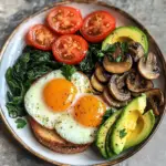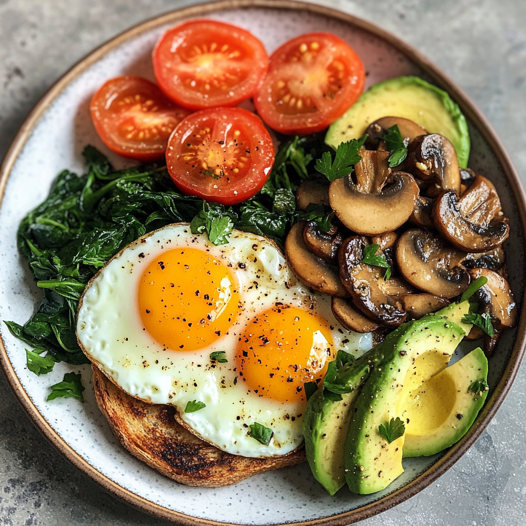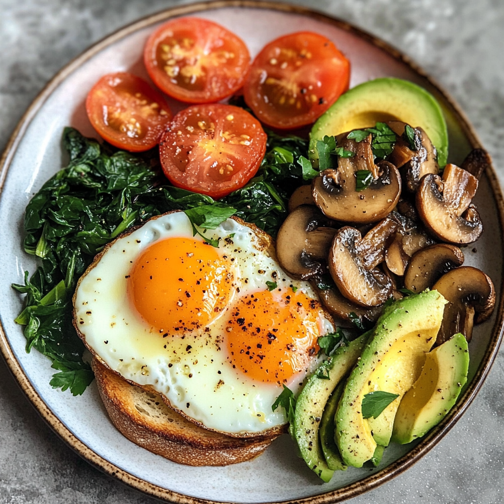 - Assemble your plate: layer toasted bread with sautéed mushrooms, place fried eggs on top, add wilted spinach, roasted tomatoes, and fanned avocado slices.