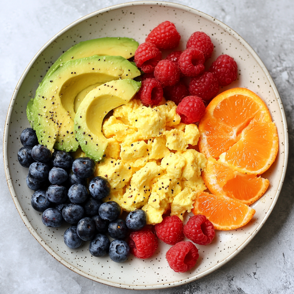 - Arrange the scrambled eggs at the center of the plate, surrounded by sliced avocado and a mix of blueberries and raspberries for a vibrant look.