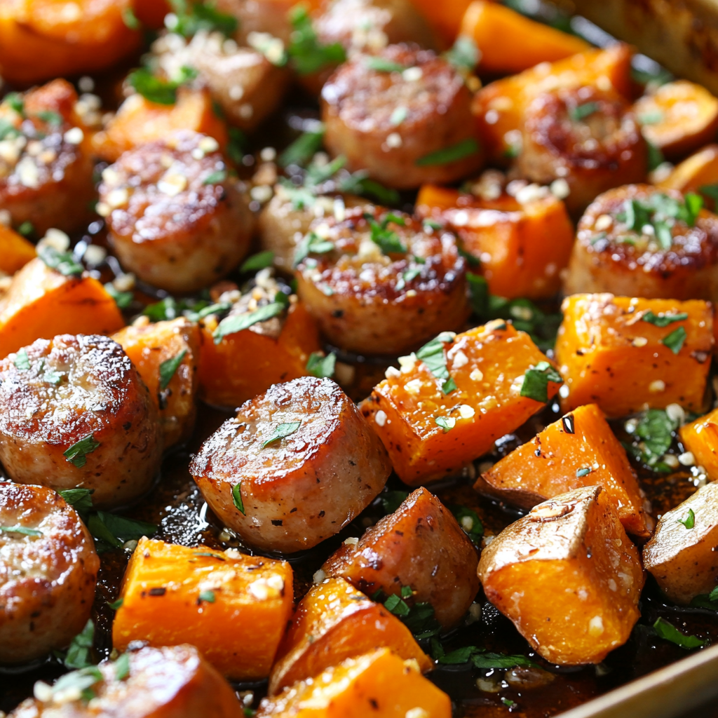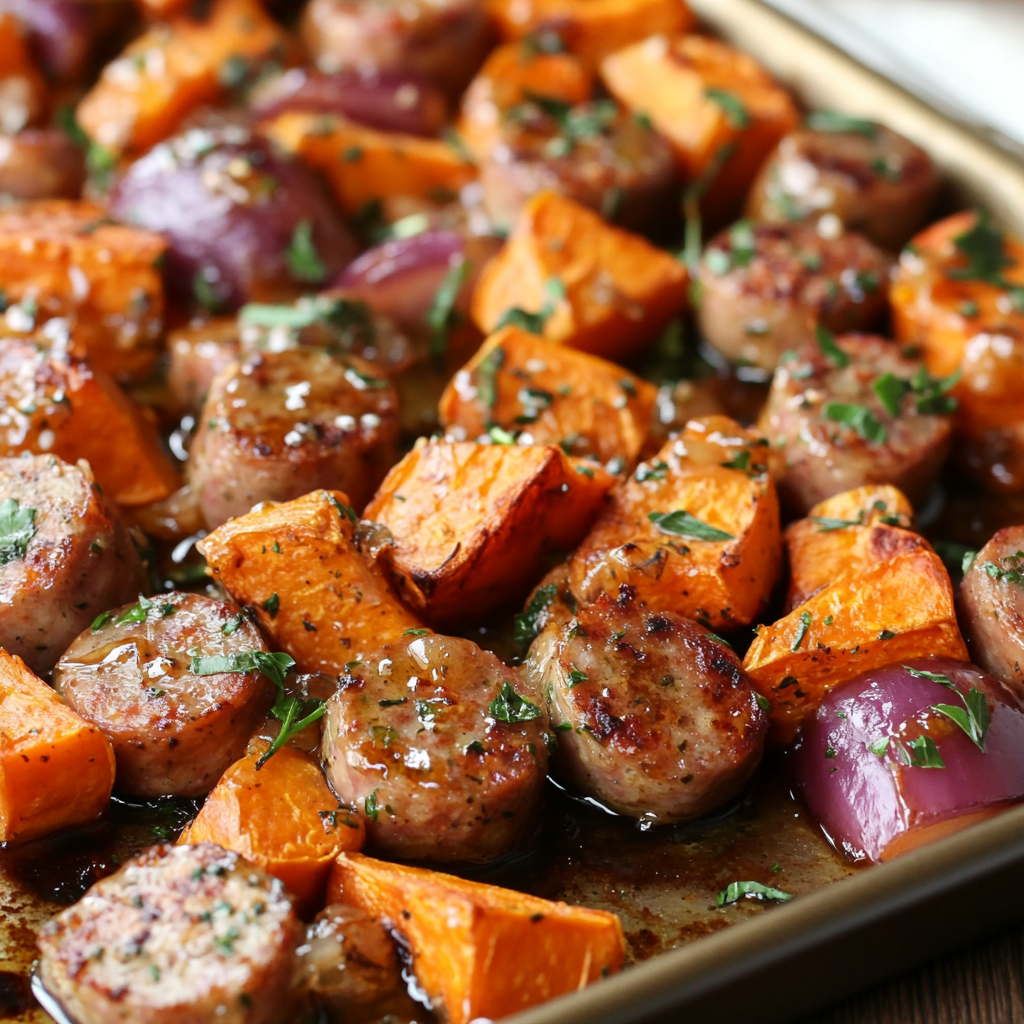 Sheet Pan Sausage and Sweet Potatoes with Honey Garlic Sauce