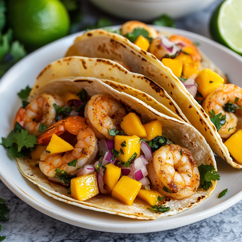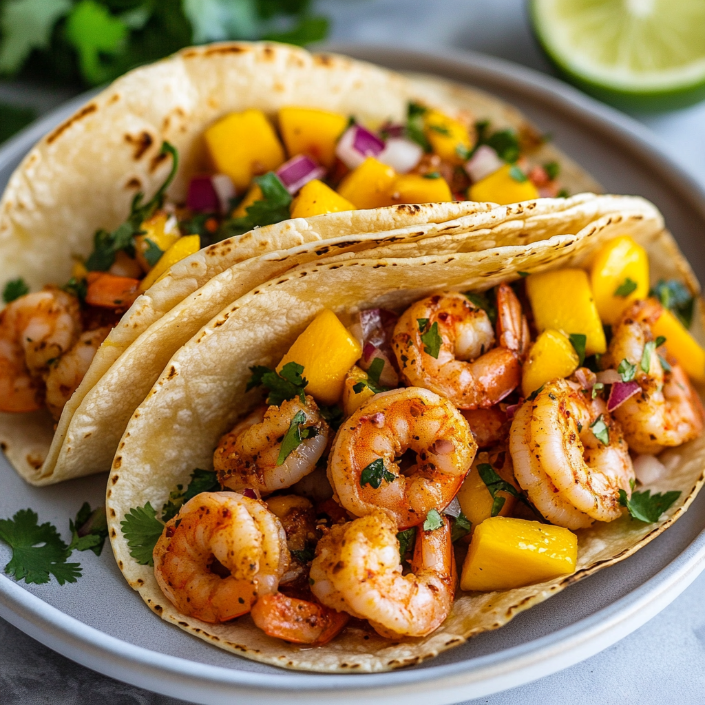 - Assemble tacos by placing shrimp on each tortilla topped with mango salsa.