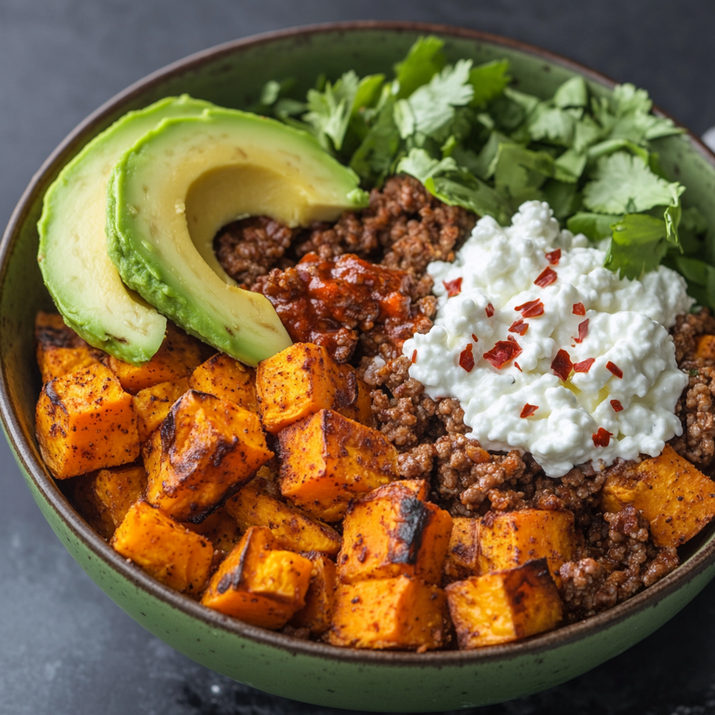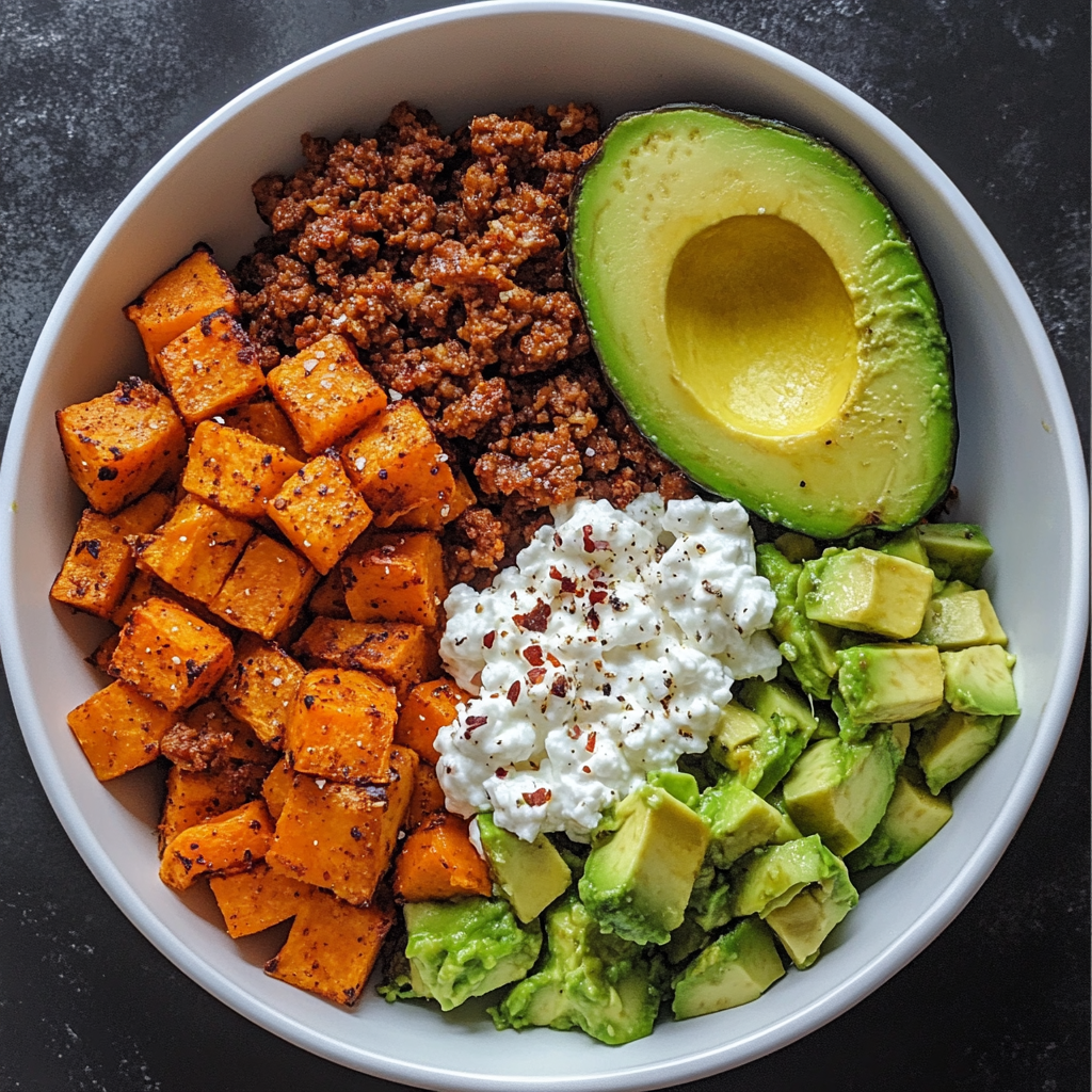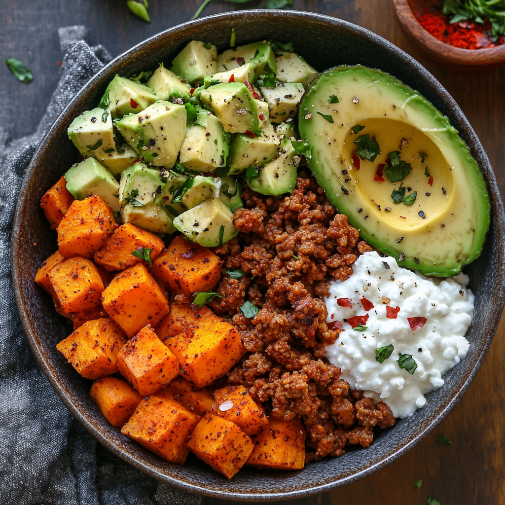 A Spicy Sweet Potato Power Bowl with Avocado & Cottage Cheese is a delightful dish that brings together wholesome ingredients and bold flavors. Perfect for lunch or dinner, this nourishing bowl combines roasted sweet potatoes, seasoned ground turkey or beef, creamy cottage cheese, and fresh avocado. It’s not just delicious; it’s also packed with nutrients to keep you energized throughout the day. Whether you’re meal prepping for the week or looking for a quick, satisfying meal, this recipe fits the bill perfectly!