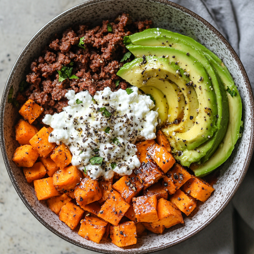 - Assemble by layering roasted sweet potatoes first in a bowl, followed by cooked beef and avocado slices arranged around the edges.