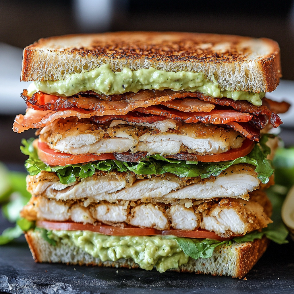 Ultimate Loaded Chicken Club Sandwich with Crispy Turkey Bacon and Avocado Ranch Spread